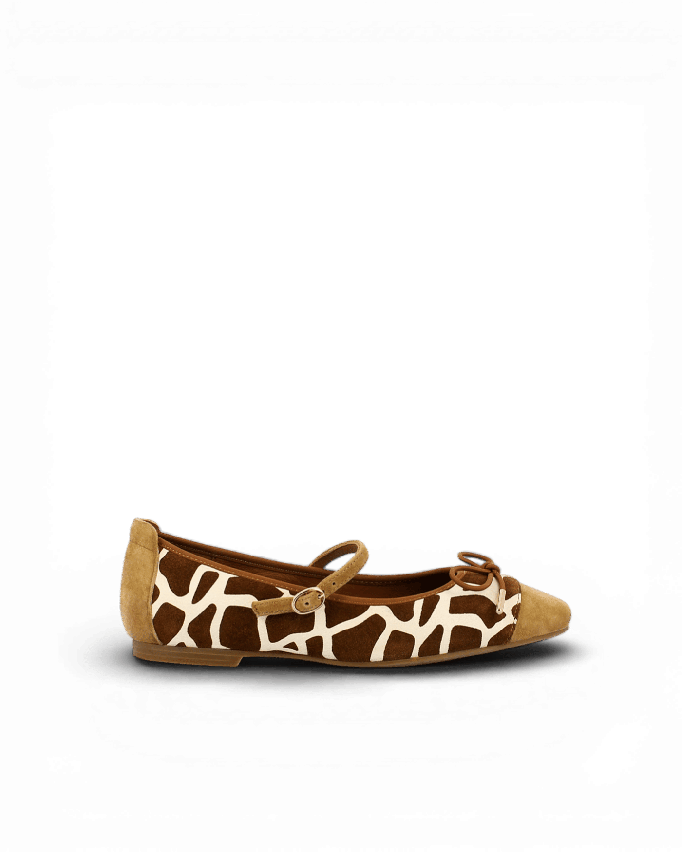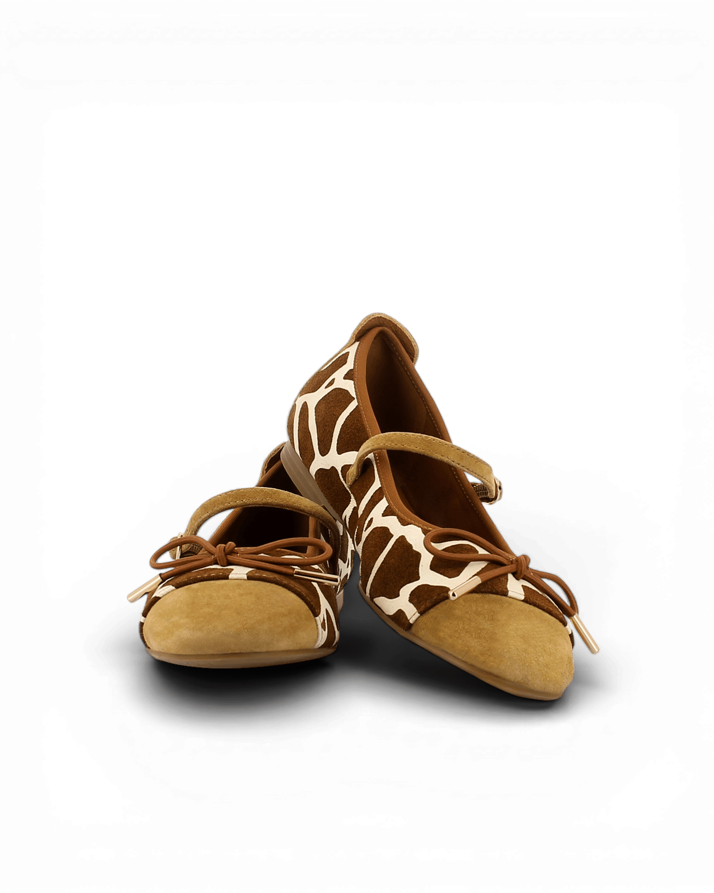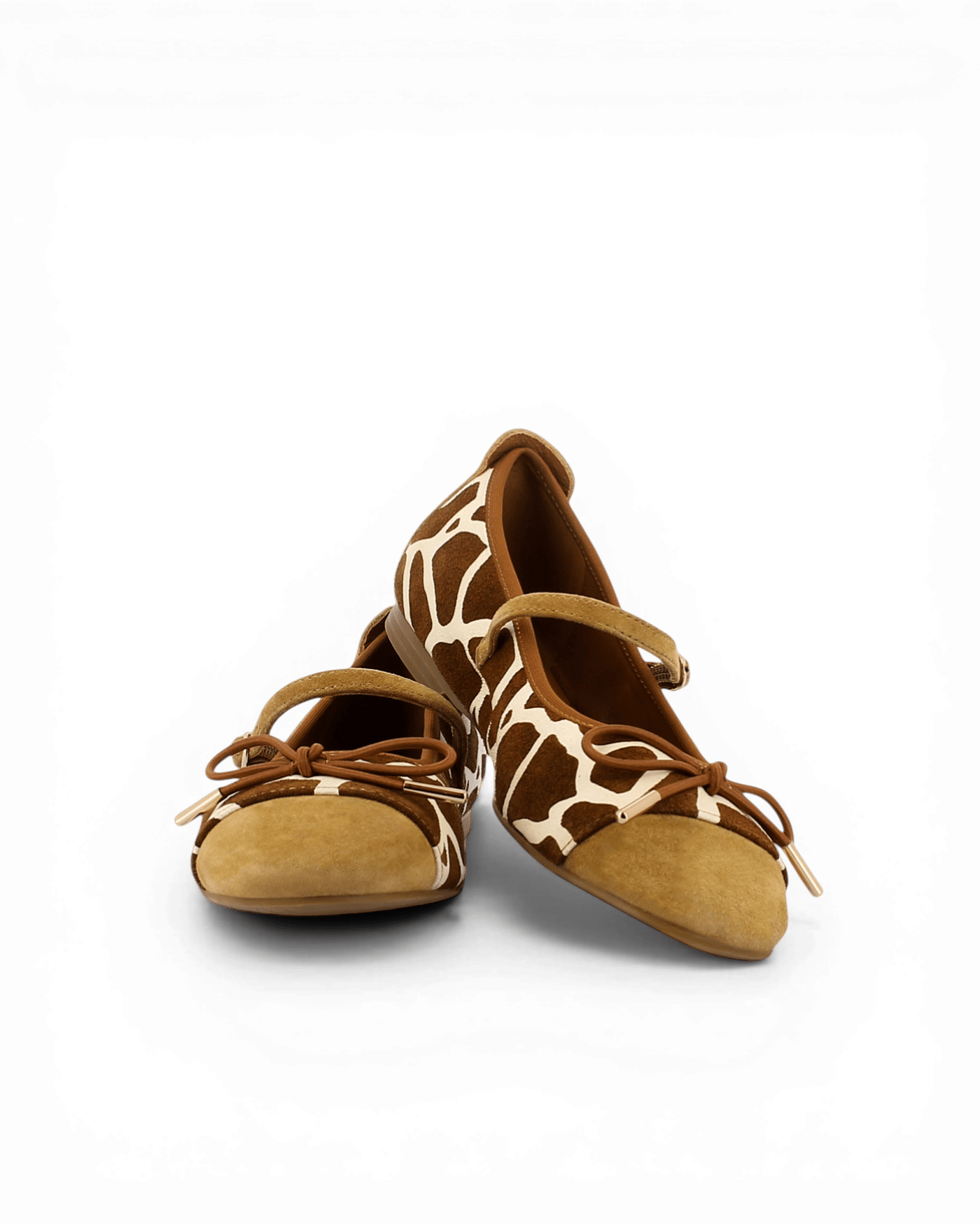 Le modèle Helen séduit par son association de motifs girafe et d’empiècements en daim qui créent une harmonie audacieuse. Les imprimés girafe habillent le cuir avec caractère et originalité. Les empiècements en cuir daim camel structurent le modèle avec douceur et naturel. La bride ajustable sur le dessus du pied avec boucle argentée assure un maintien personnalisé tout au long de la journée. En outre, chaque détail révèle une attention particulière portée à l’équilibre esthétique. Le nœud élastique à l’avant ajoute une touche féminine délicate qui facilite l’enfilage. Cette composition témoigne d’une approche audacieuse de la chaussure classique qui ose la singularité.