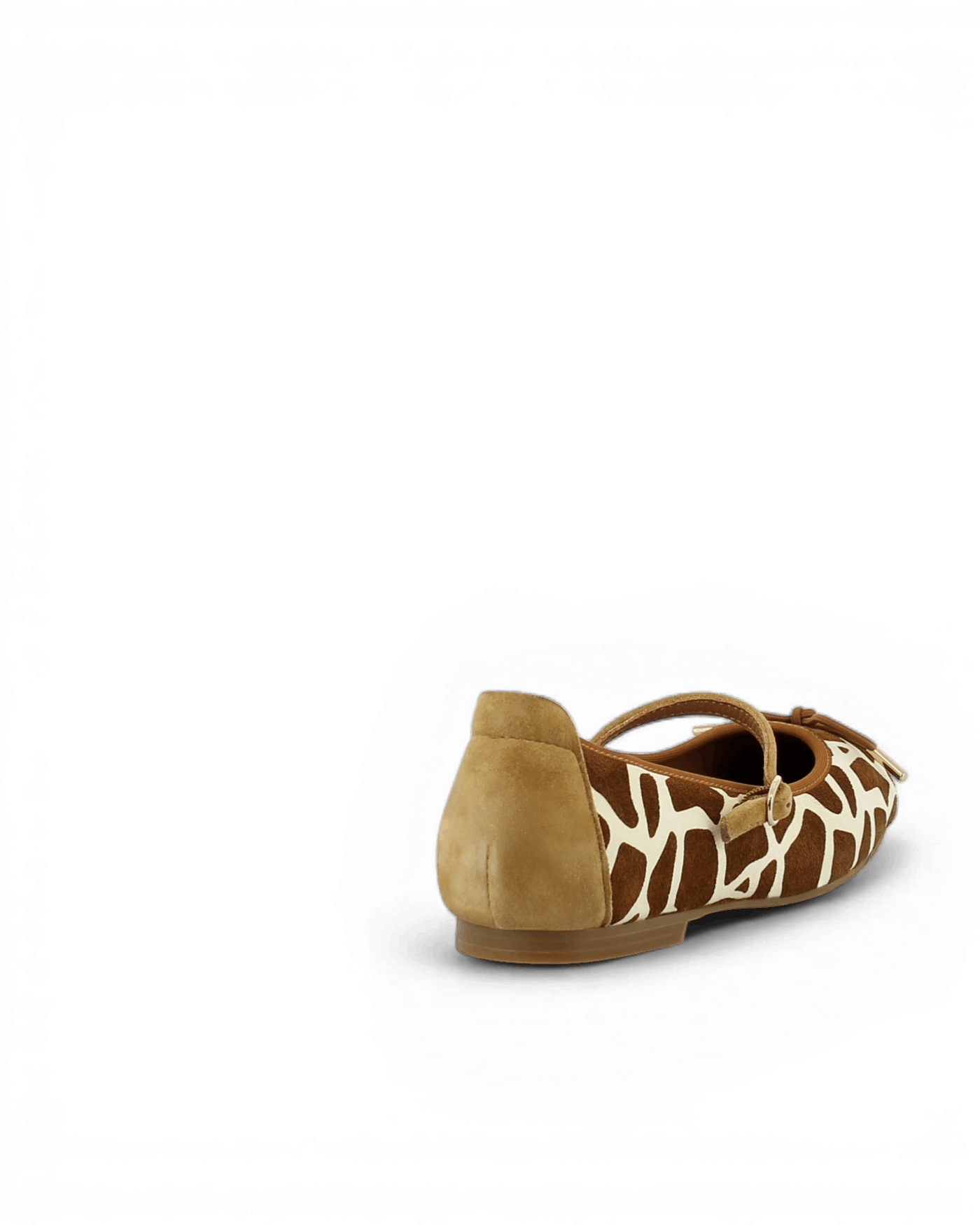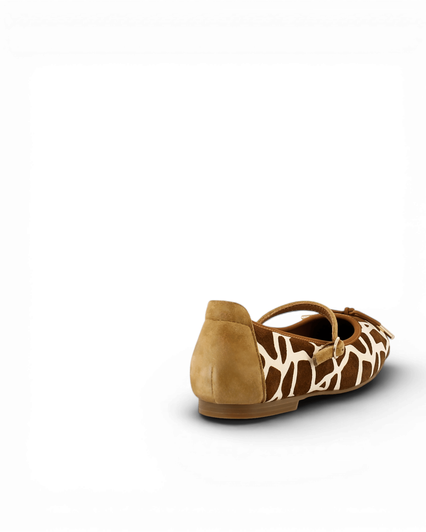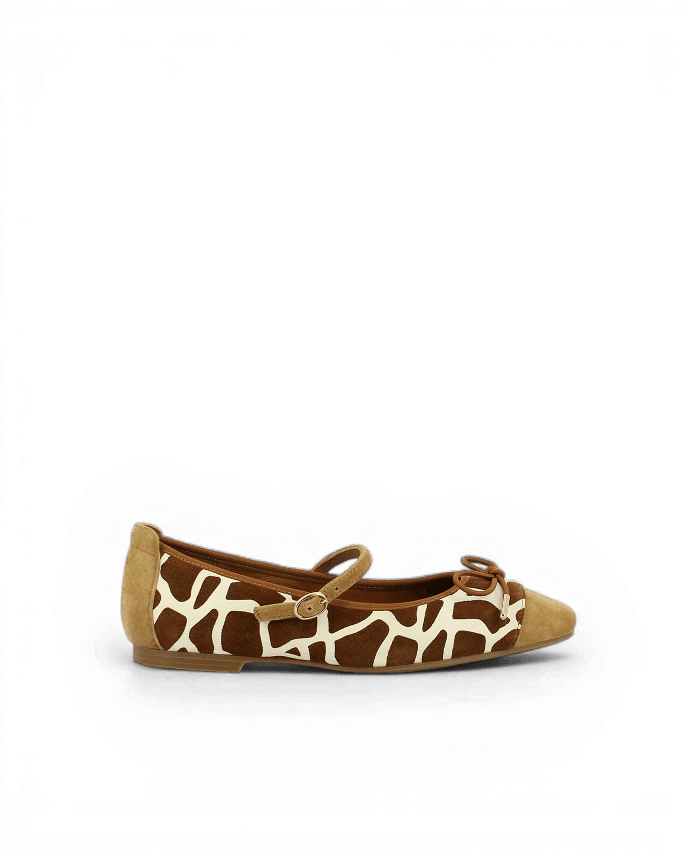 Le modèle Helen séduit par son association de motifs girafe et d’empiècements en daim qui créent une harmonie audacieuse. Les imprimés girafe habillent le cuir avec caractère et originalité. Les empiècements en cuir daim camel structurent le modèle avec douceur et naturel. La bride ajustable sur le dessus du pied avec boucle argentée assure un maintien personnalisé tout au long de la journée. En outre, chaque détail révèle une attention particulière portée à l’équilibre esthétique. Le nœud élastique à l’avant ajoute une touche féminine délicate qui facilite l’enfilage. Cette composition témoigne d’une approche audacieuse de la chaussure classique qui ose la singularité.
