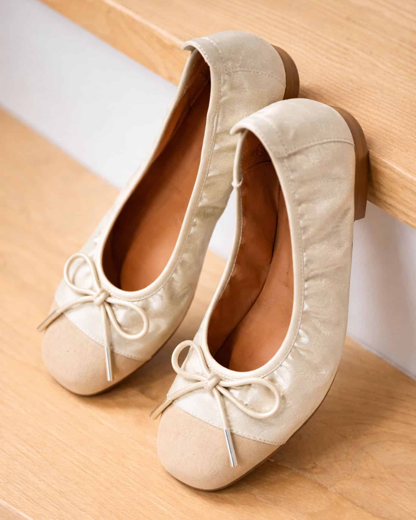 La teinte dorée, ni trop flashy ni trop discrète, est par ailleurs juste ce qu’il faut pour apporter une touche de lumière et de sophistication à votre look. Ce choix de couleur permet une grande polyvalence. Elle s’associe aussi bien à des vêtements neutres qu’à des tenues plus colorées, pour un effet stylé et raffiné. Avec leur petite touche de beige sur la pointe du pied, elles offrent originalité et raffinement. Un autre élément apporte une grande distinction à cette paire de ballerines : le nœud doré placé délicatement sur le dessus du pied. Simple et discret, il permet de mettre en valeur la féminité et l’élégance de la ballerine.