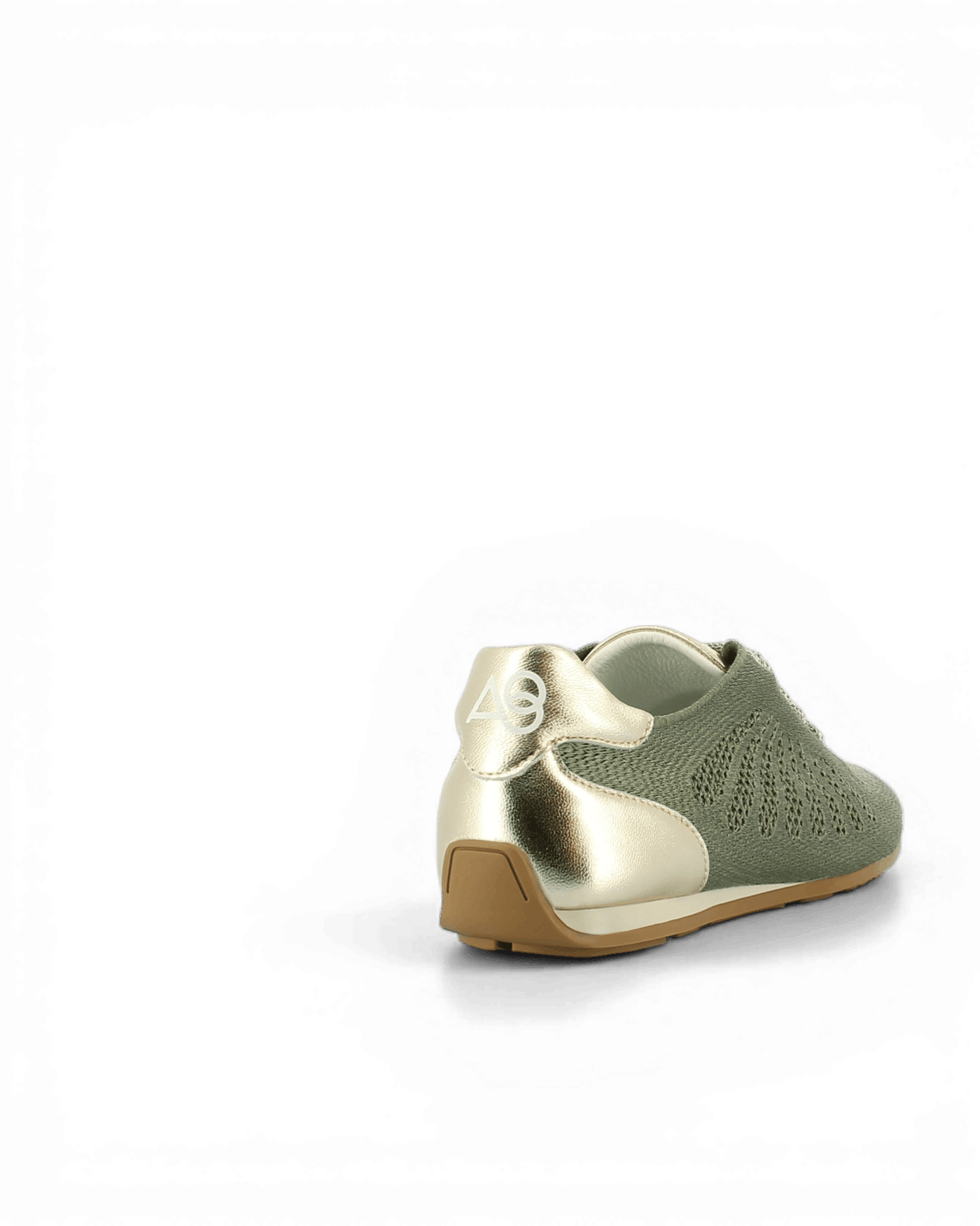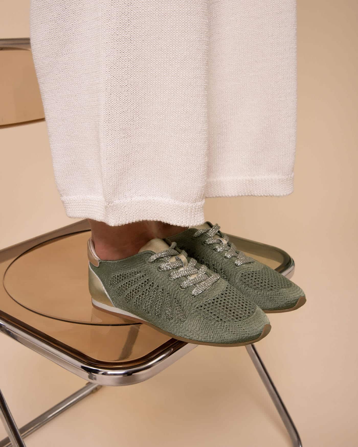 Cette basket se distingue par sa tige en knit kaki qui offre légèreté et respirabilité exceptionnelles, idéale pour affronter les journées chaudes. Par ailleurs, les empiècements en cuir beige nacré structurent l’ensemble avec raffinement et apportent une dimension luxueuse à la silhouette sportive. De plus, les lacets argentés créent une touche lumineuse qui sublime la palette de couleurs naturelles et terreuses. Le motif ajouré du knit génère un jeu de transparence subtil et moderne, permettant une aération constante du pied. Enfin, la semelle bicolore beige et gomme complète harmonieusement l’esthétique épurée du modèle Zouk, ancrant visuellement la chaussure dans une modernité assumée.