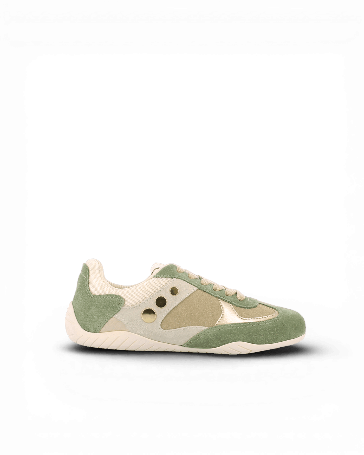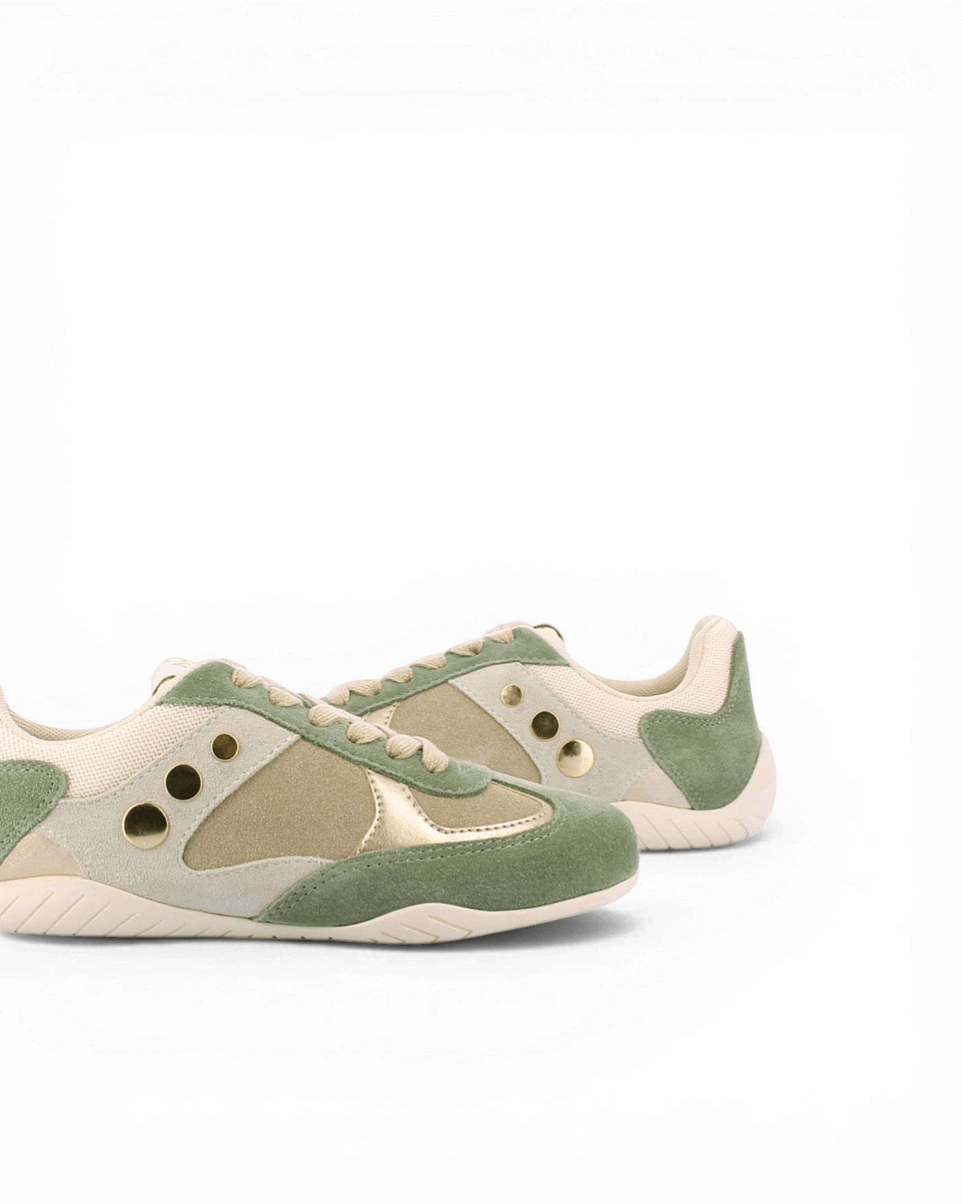 Cette basket basse femme se distingue par son jeu de matières et de couleurs apaisantes. La tige associe habilement cuir et textile dans des teintes vert sauge, beige et écru qui évoquent la nature. Par ailleurs, les empiècements en cuir suédé apportent une douceur tactile appréciable et une texture veloutée. Sur le côté, trois bijoux dorés captent subtilement la lumière. Ces détails métallisés rehaussent l’ensemble avec raffinement. La combinaison des matériaux crée une harmonie visuelle sophistiquée. Ainsi, cette chaussure incarne une sophistication discrète et contemporaine.