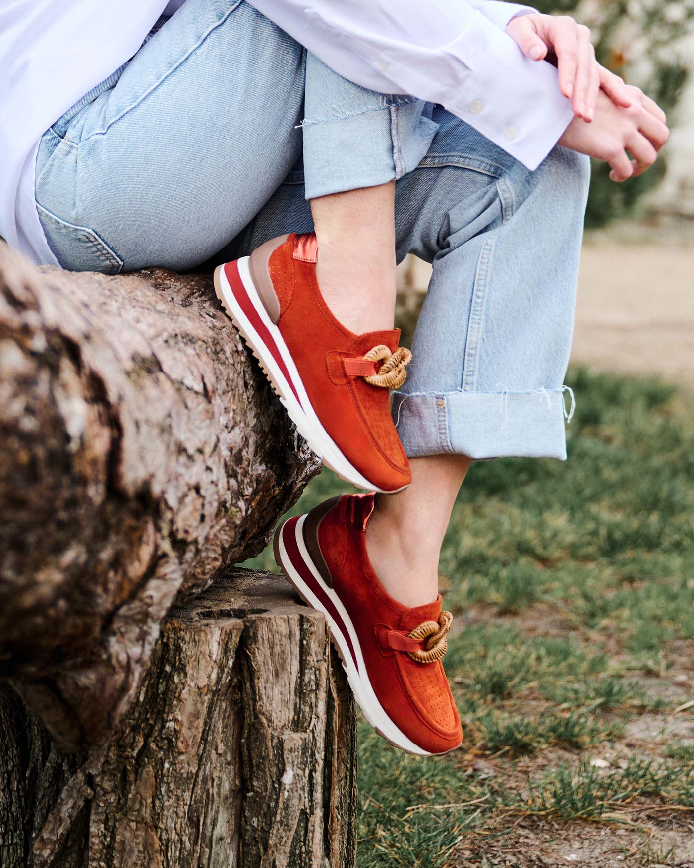 Laissez-vous séduire par notre nouveau modèle de basket femme velours orange Xena, alliant élégance et originalité. Ces sneakers sont à la fois élégantes et contemporaines. Elles sont la combinaison idéale entre confort et originalité, grâce au cuir velours qui confère à ces baskets un éclat doux et luxueux. Par ailleurs, la chaîne à trois maillons en rotin sur le dessus de la chaussure, qui s’inspire du mocassin élégant, apporte une touche audacieuse et moderne à ce modèle de basket.