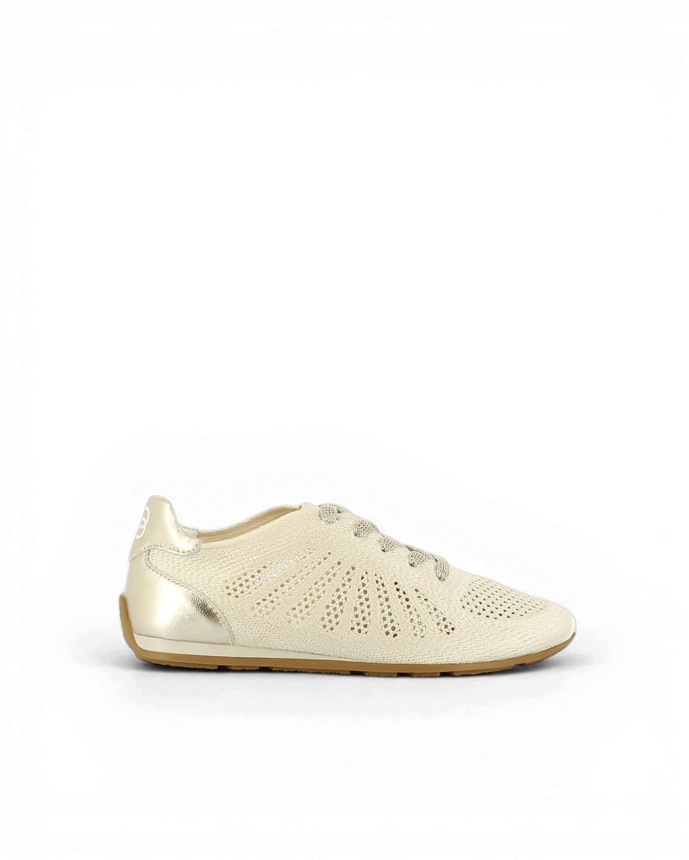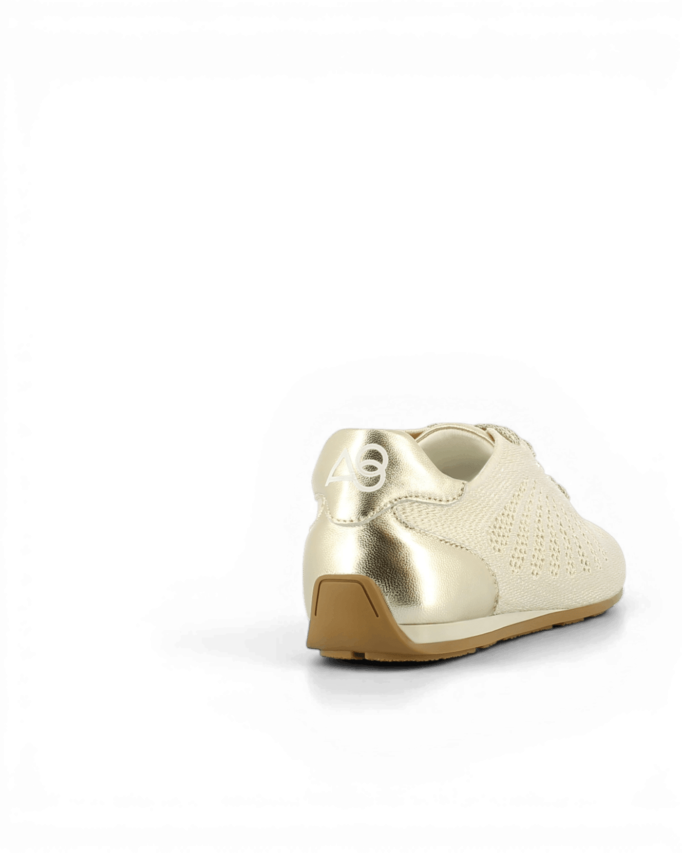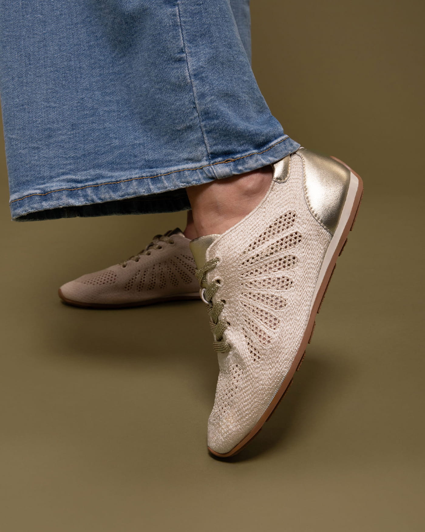 Le modèle Zouk se distingue par sa tige en knit écru qui dégage une élégance naturelle et apaisante. Par ailleurs, les empiècements en cuir beige nacré apportent structure et raffinement à l’ensemble. De plus, les lacets dorés créent une touche précieuse qui sublime la palette de tons clairs. Le motif ajouré du knit dessine des arabesques délicates sur l’empeigne, offrant légèreté et respirabilité exceptionnelle. Ainsi, chaque détail participe à cette esthétique épurée. Enfin, la semelle bicolore beige et gomme naturelle complète harmonieusement cette palette lumineuse. La construction ajourée permet une circulation d’air optimale tout en préservant l’élégance du modèle.