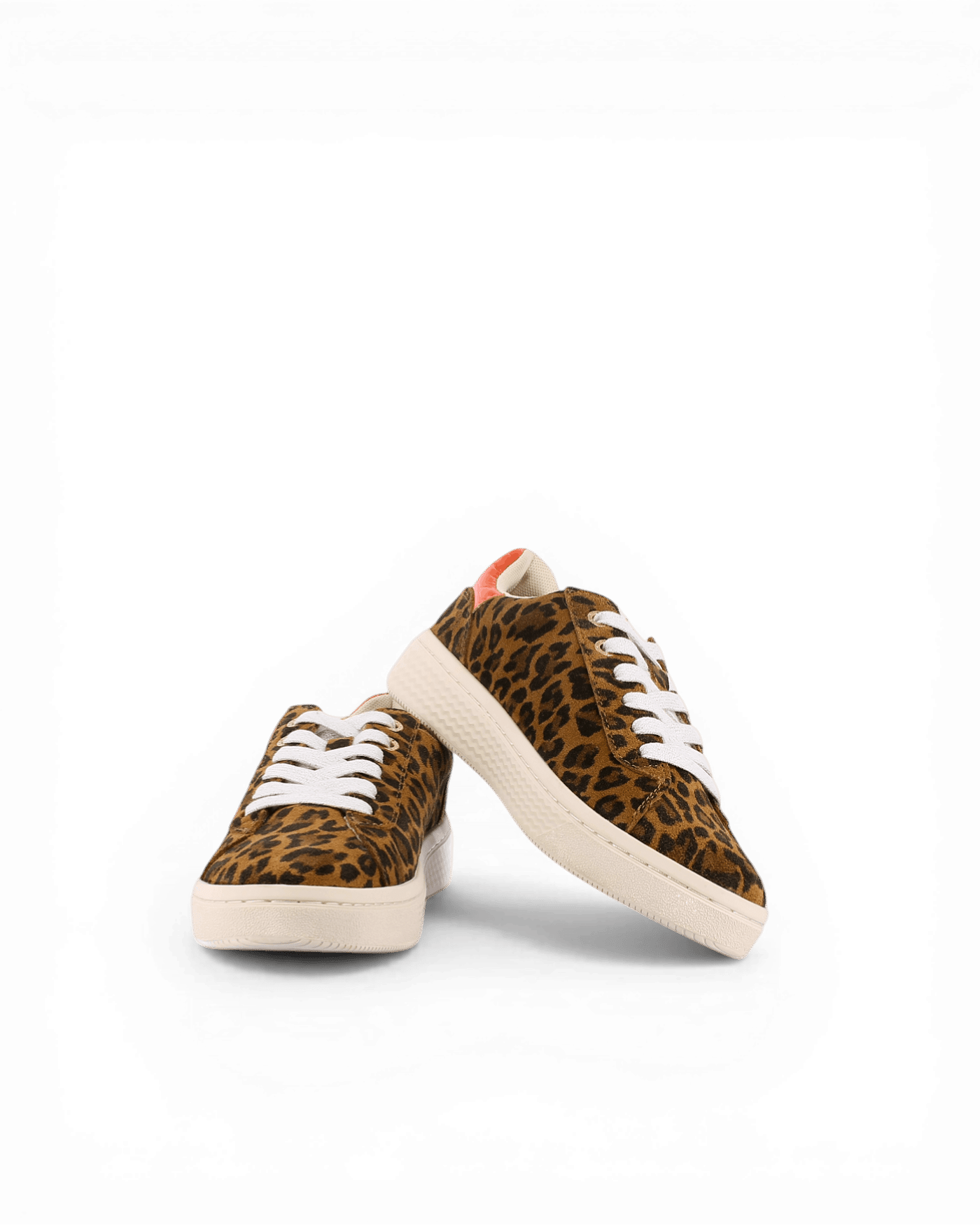 Cette basket léopard femme se distingue par son imprimé léopard intemporel qui habille une tige entièrement en cuir véritable. Par ailleurs, les empiècements en cuir croco apportent une touche de luxe remarquable et structurent l’ensemble avec caractère. À l’arrière, la touche corail dynamise le modèle avec subtilité et apporte une note de fraîcheur inattendue. Sur le côté, l’empiècement doré capte la lumière avec raffinement. Cette composition chromatique révèle un équilibre parfait entre audace et sophistication. La semelle en gomme blanche contraste élégamment avec l’intensité de l’imprimé et allège visuellement la silhouette.