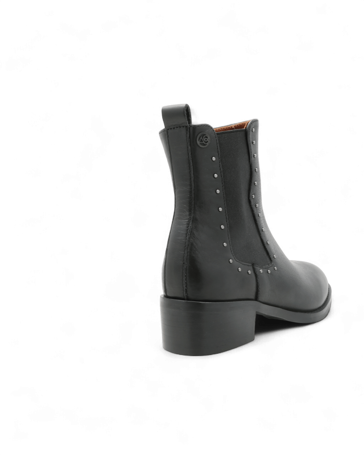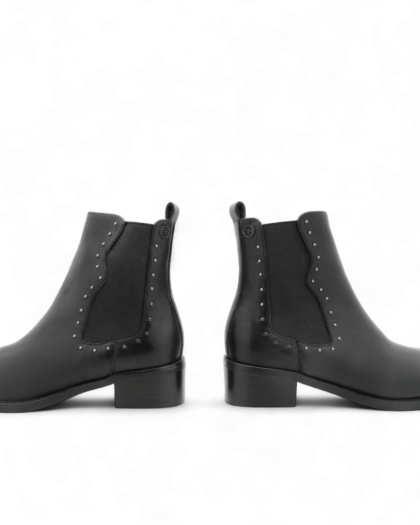 Confectionnée en cuir lisse noir, cette bottine séduit par sa sobriété élégante. Elle est rehaussée de petits clous métalliques discrets qui soulignent les empiècements élastiqués caractéristiques de la forme chelsea. Une touche subtilement rock qui lui donne du relief sans compromettre sa polyvalence.