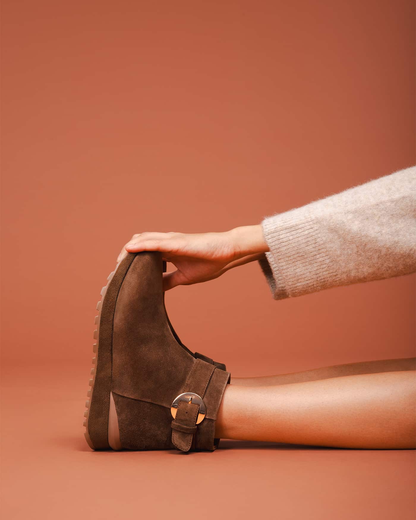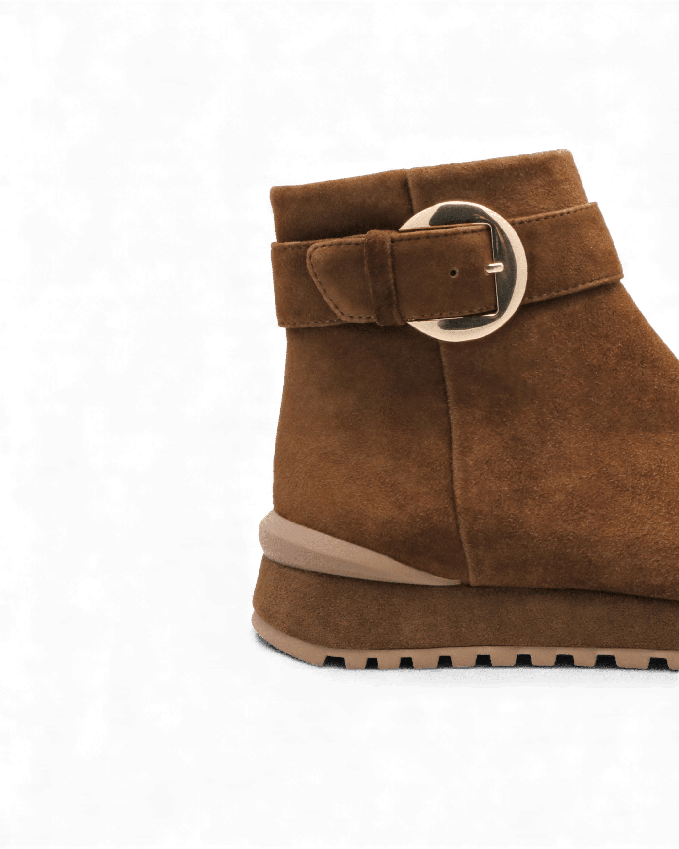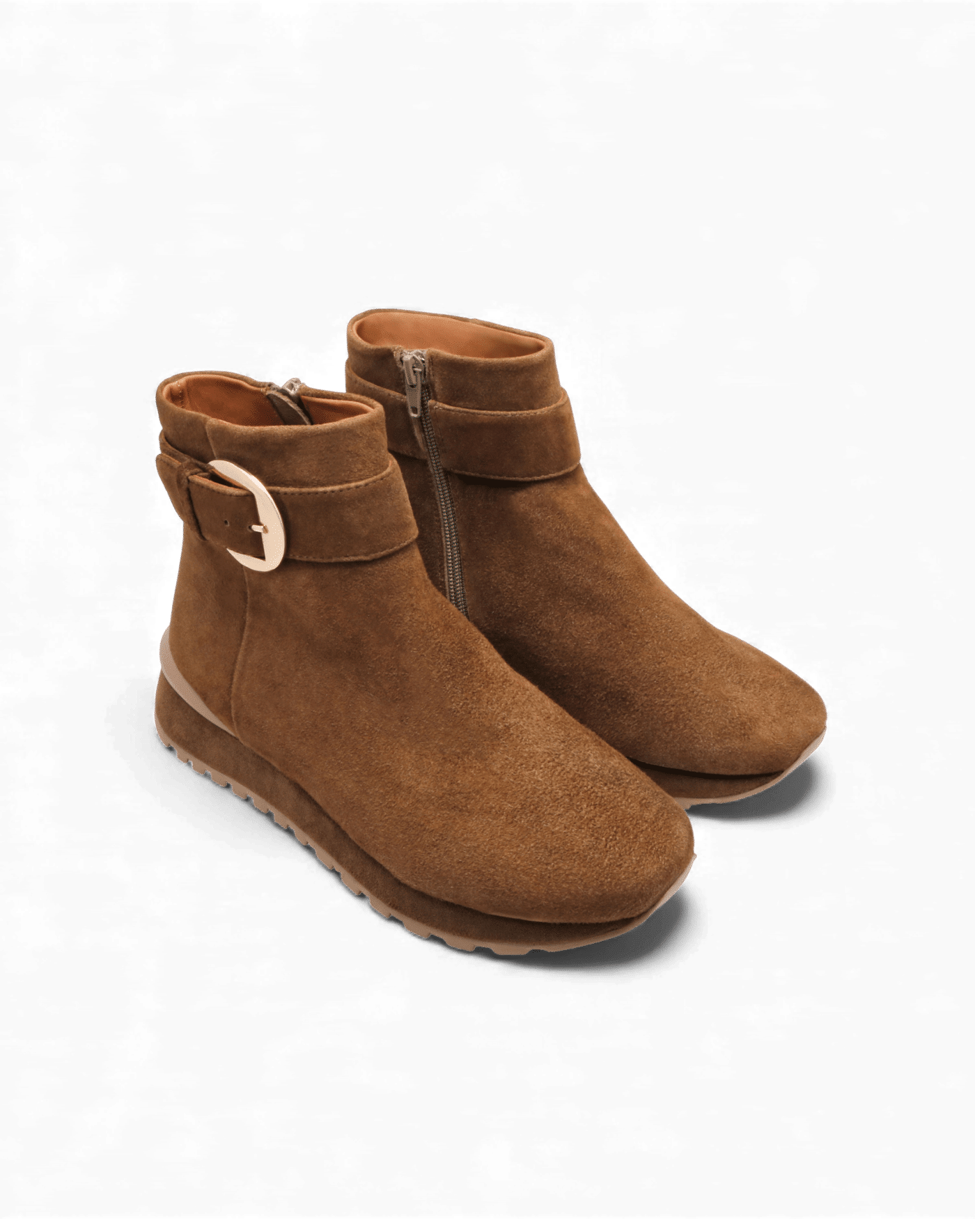 Le détail raffiné de la boucle dorée, large et brillante, apporte une touche de lumière à la silhouette. Facile à enfiler grâce à sa fermeture zippée intérieure, ce modèle s’adapte parfaitement aux morphologies. Le col légèrement montant maintient la cheville tout en douceur, tandis que la semelle extérieure crantée promet une bonne adhérence.