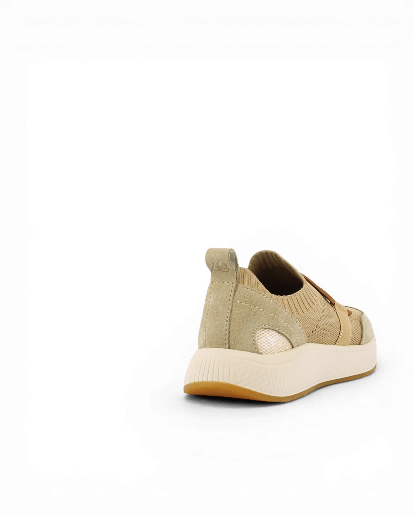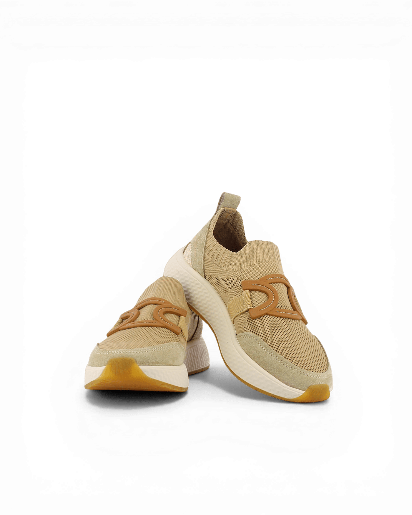 Ce mocassin basket femme beige déploie une palette de tons sable et caramel particulièrement harmonieuse qui évoque la douceur des matières naturelles. La tige mêle habilement cuir et textile tricoté pour créer une texture riche et tactile. Les empiècements ajourés favorisent une ventilation optimale tout en dessinant des motifs graphiques subtils. Sur le dessus, une chaîne en cuir camel apporte la touche signature du mocassin classique, rappelant l’héritage artisanal de cette chaussure intemporelle. Les inserts en daim rehaussent l’ensemble avec douceur et créent des jeux de matières raffinés. La semelle miel complète cette composition chromatique naturelle, établissant une continuité visuelle parfaitement maîtrisée. L’ensemble révèle une identité affirmée qui séduit par sa cohérence esthétique.