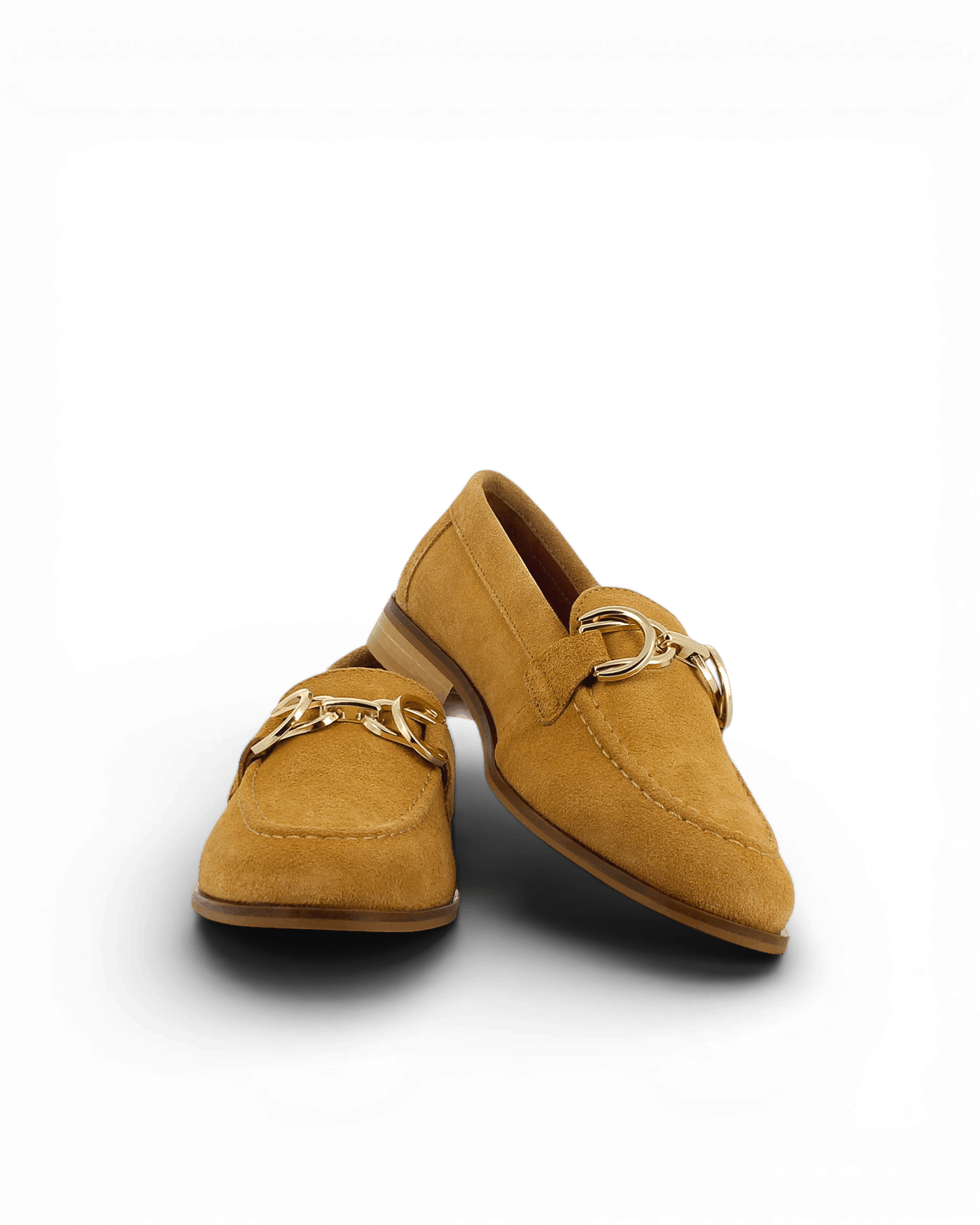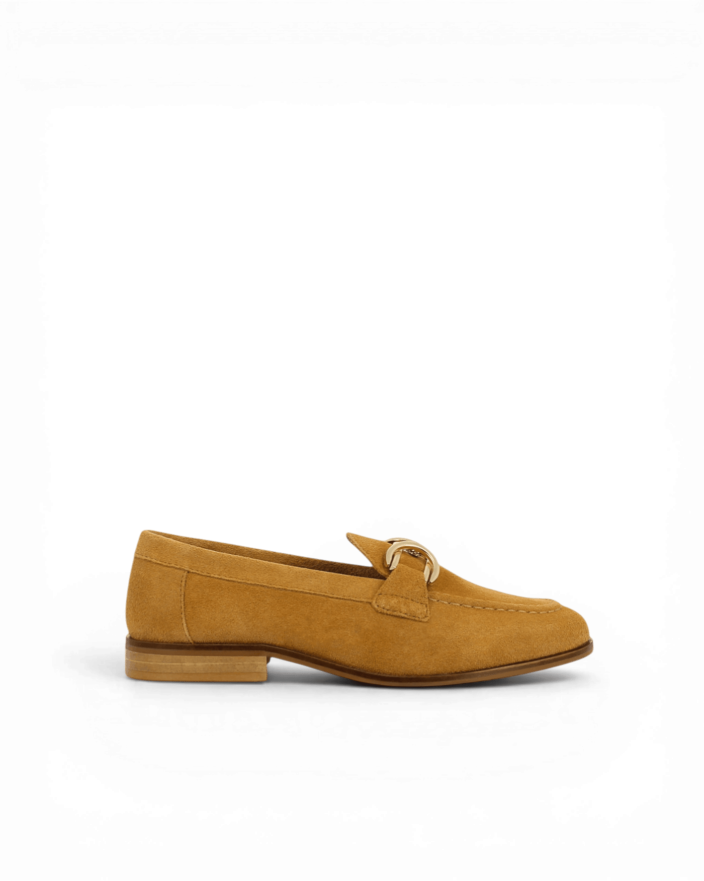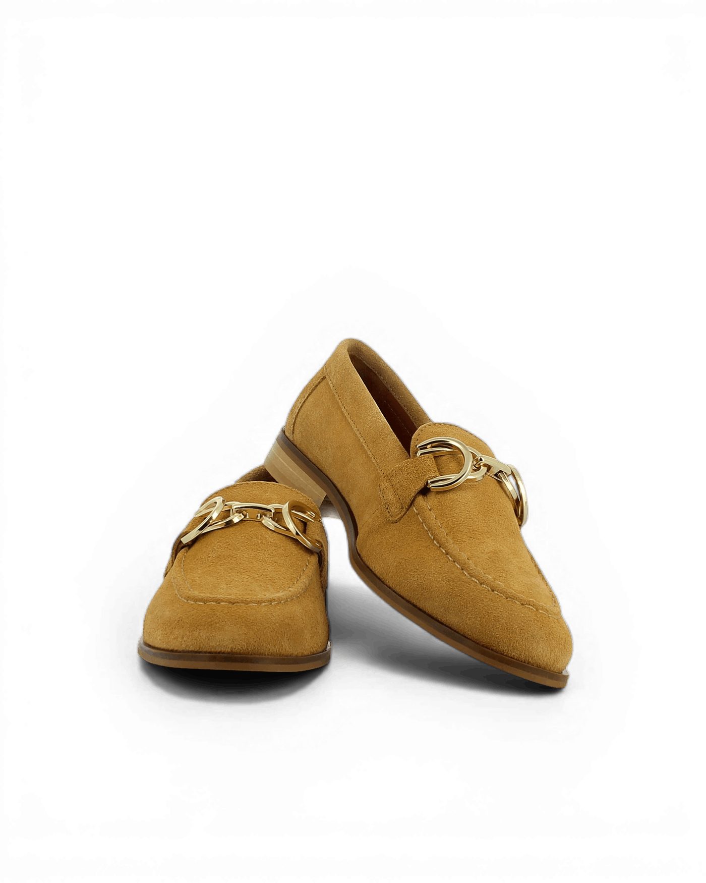 Ce mocassin femme au coloris biscuit se distingue par sa silhouette épurée et classique. La tige intégralement en cuir velours offre une texture douce et noble au toucher. Cette matière confère à la chaussure une élégance naturelle qui traverse les saisons sans jamais se démoder. Par ailleurs, la chaîne métallique dorée positionnée sur l’avant apporte une touche de sophistication contemporaine. Ce détail précieux attire subtilement le regard sans ostentation. De plus, le talon de 2 cm assure une légère élévation qui affine la silhouette tout en préservant votre confort de marche.