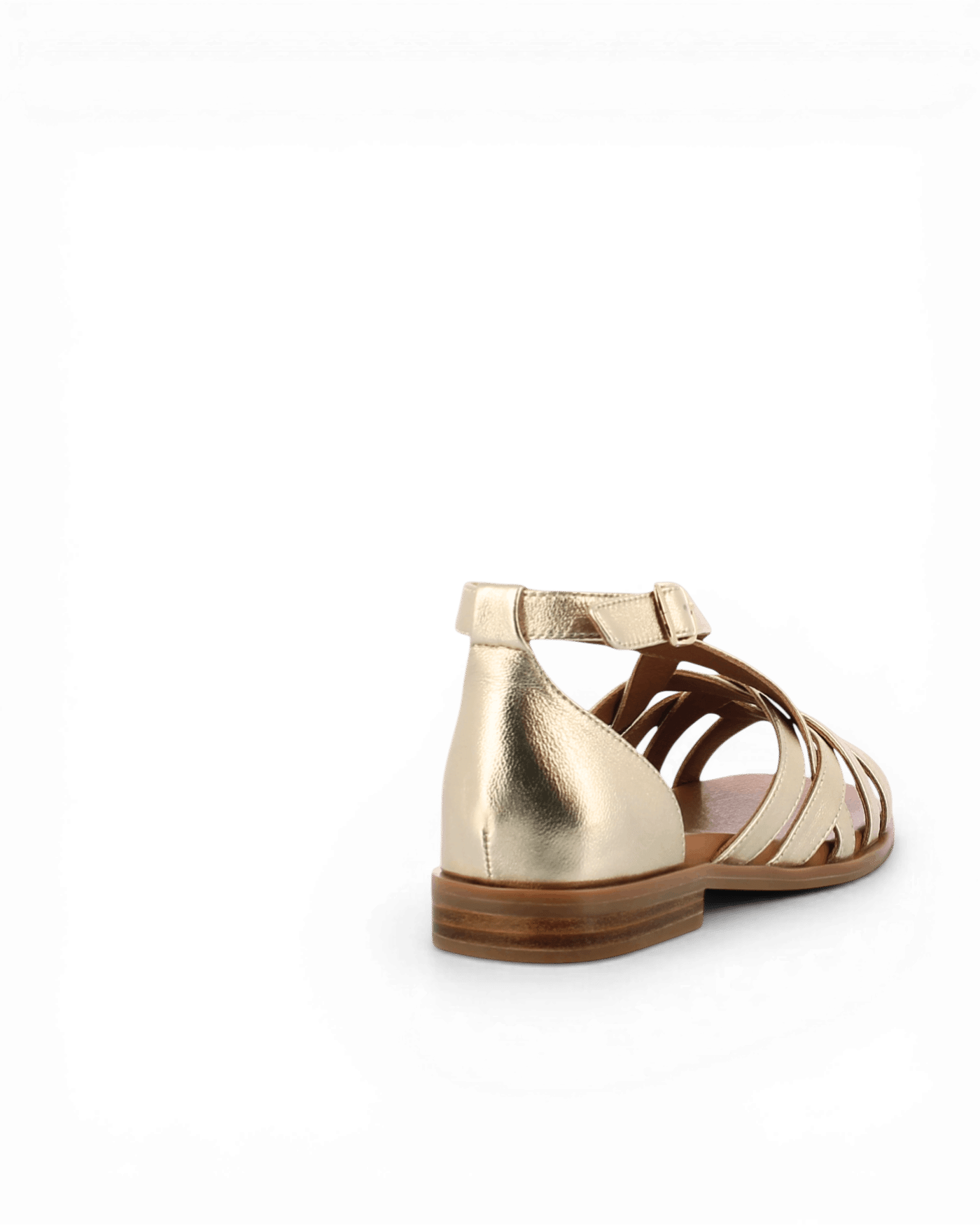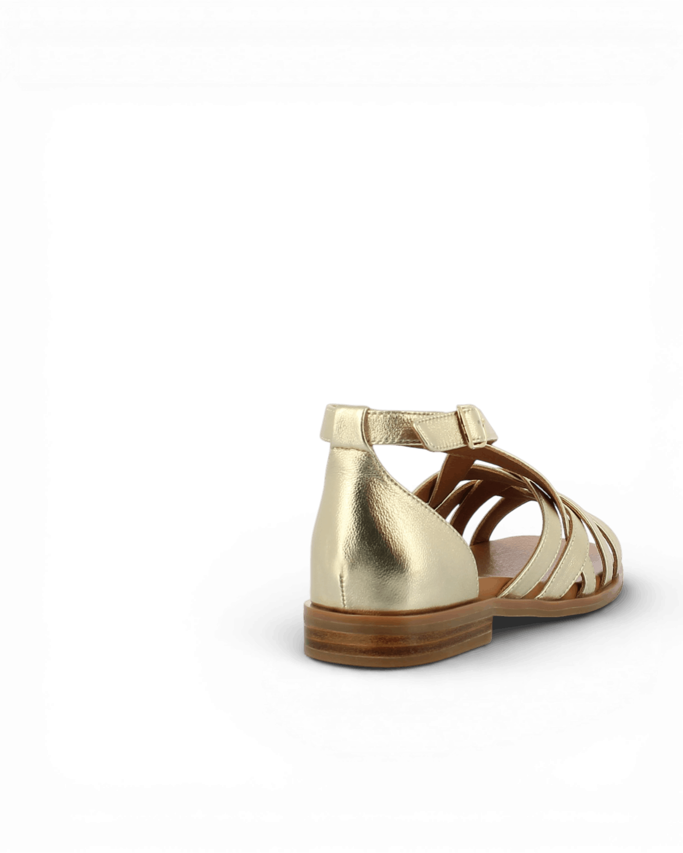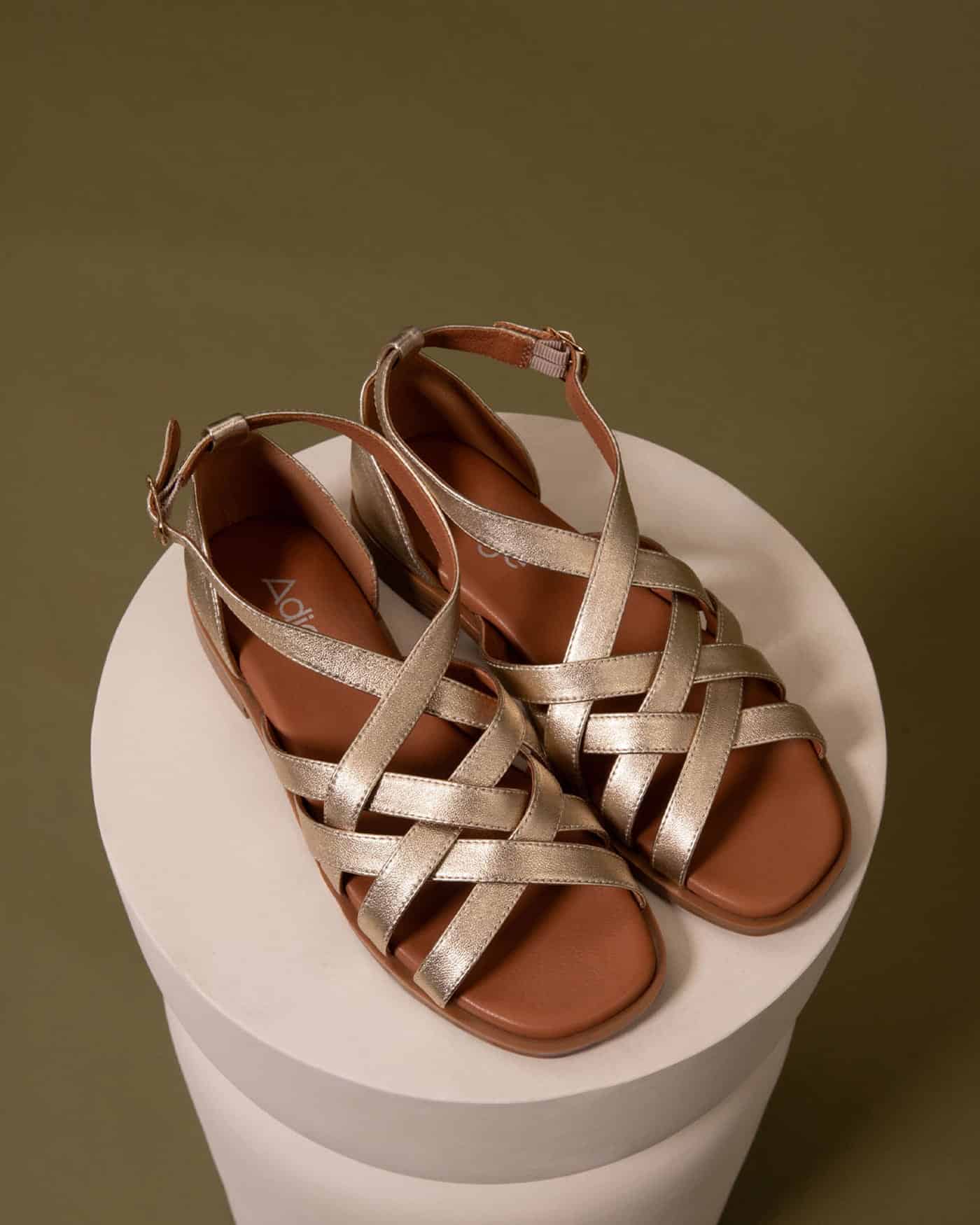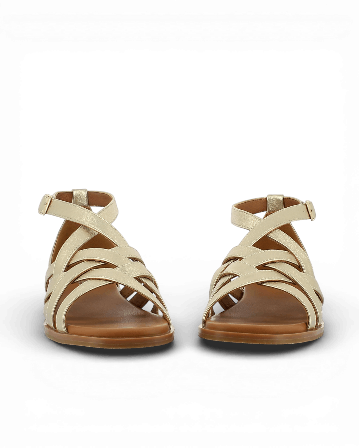 Ces sandales dorées plates se démarquent par leurs multiples brides entrecroisées en cuir doré qui dessinent une silhouette aérienne et féminine. Par ailleurs, la bride de cheville ajustable avec sa boucle dorée assure un maintien optimal tout en sublimant la finesse de votre jambe. L’ensemble repose sur une semelle en cuir naturel qui contraste harmonieusement avec les tons dorés. De plus, le petit talon de 2,5 cm apporte une élévation subtile sans compromettre votre confort. Le jeu de lanières crée un effet graphique raffiné qui enveloppe le pied avec délicatesse, tandis que la finition dorée attrape délicatement les rayons du soleil pour un effet sophistiqué et lumineux.